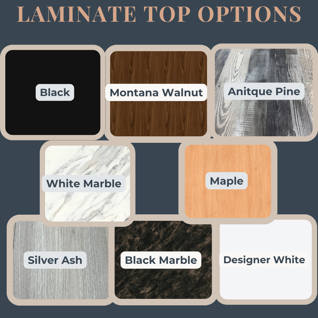 | Laminate Top Color | Black, Designer White, Kensington Maple, Black Marble, Antique Pine, White Marble, Montana Walnut, Silver Ash Grey |