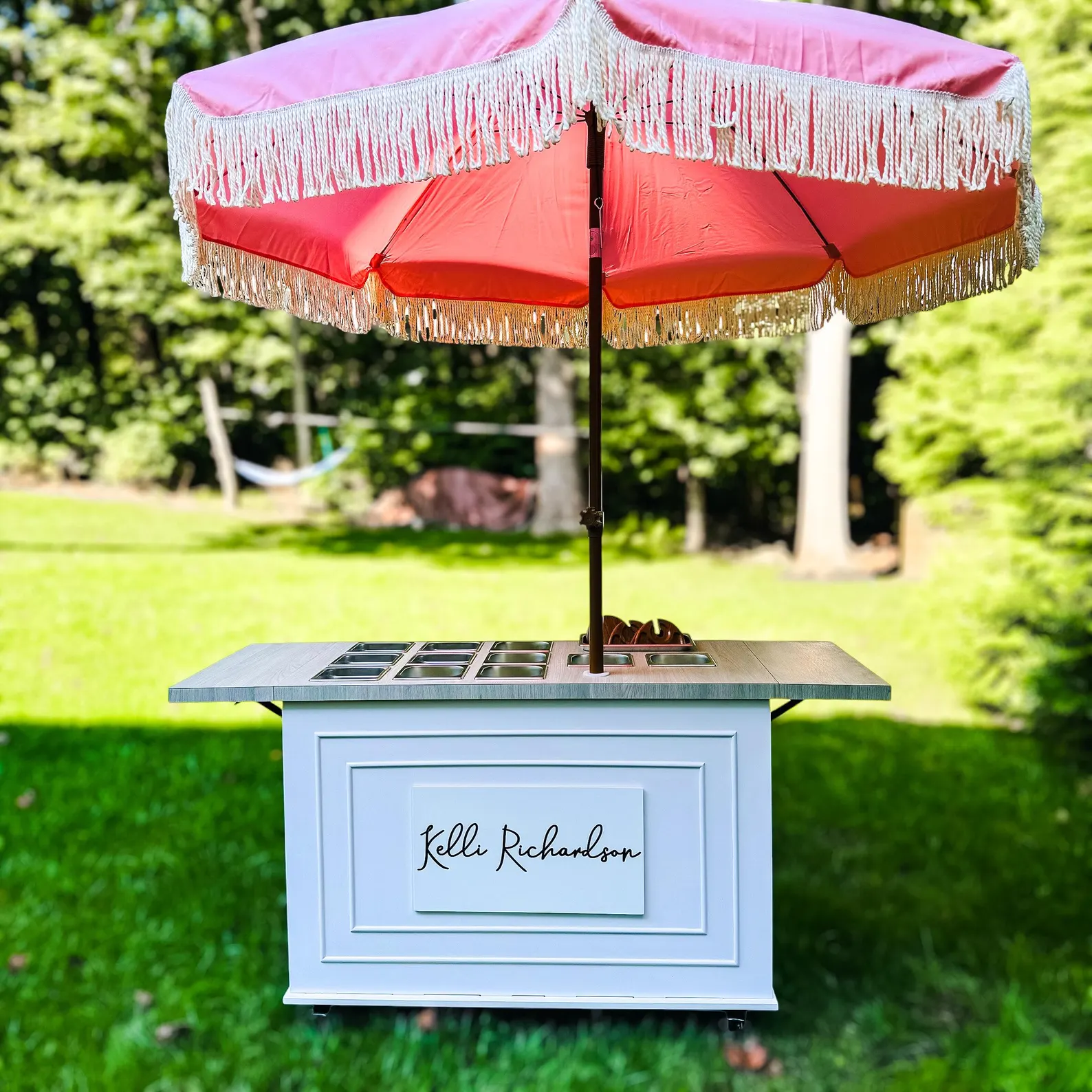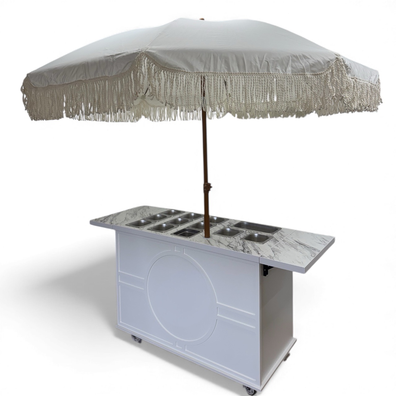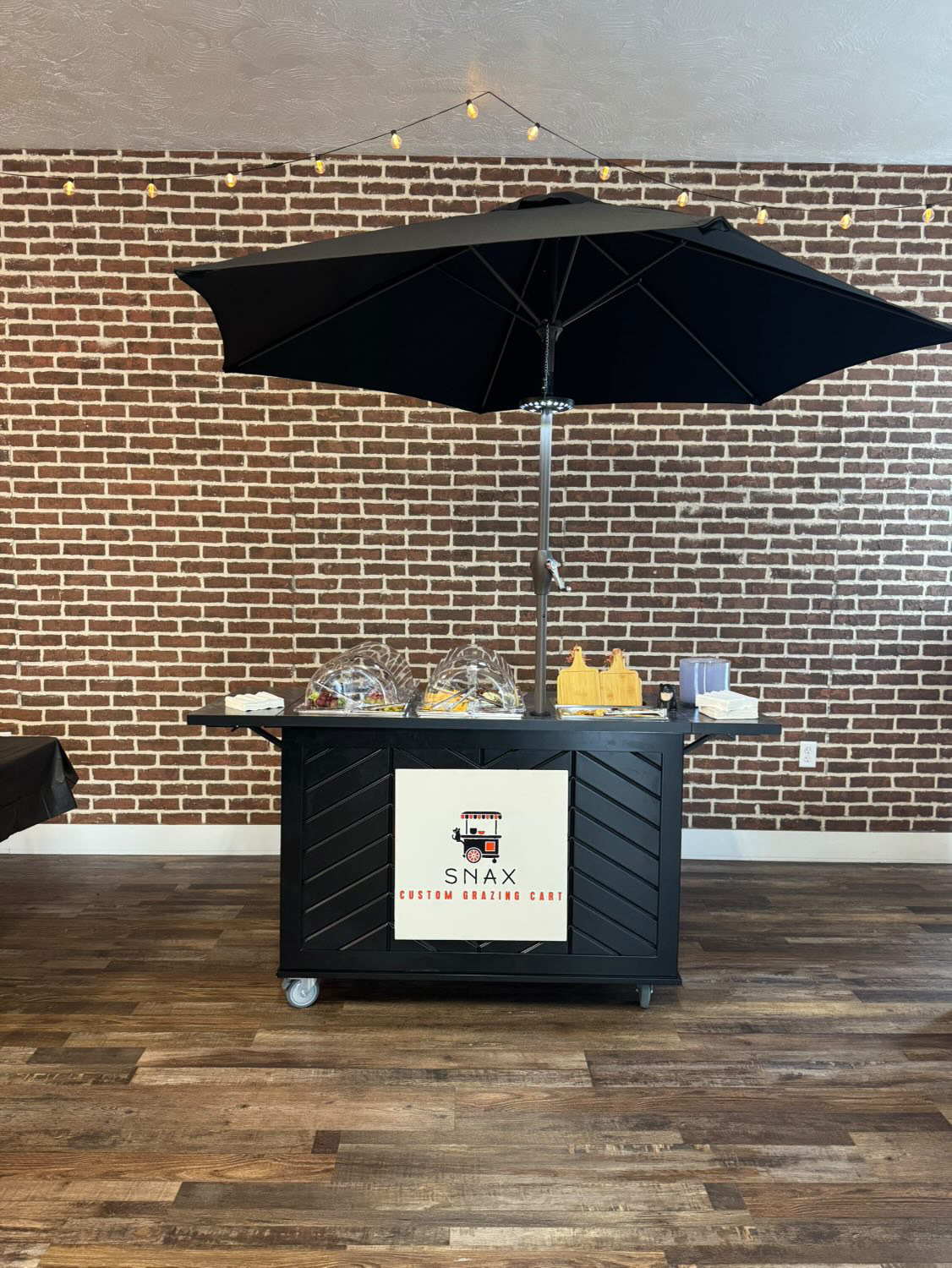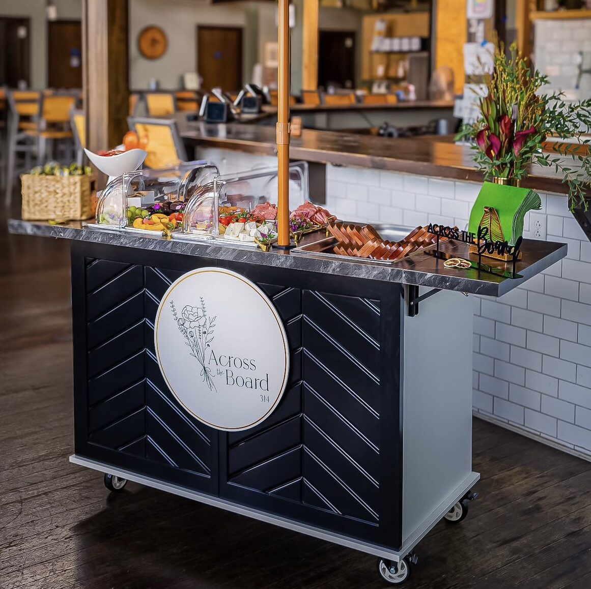 This mobile event cart is perfect for catering, parties, weddings, and vending, offering a versatile solution for serving food like charcuterie, coffee, ice cream, and snacks. The collapsible cart on wheels is ideal for use at farmers markets and other gatherings.