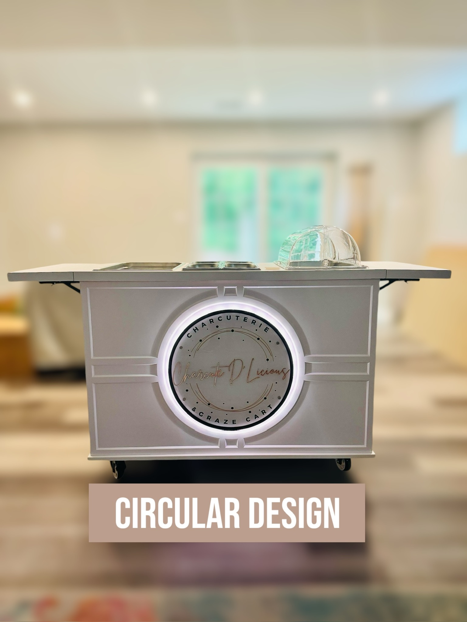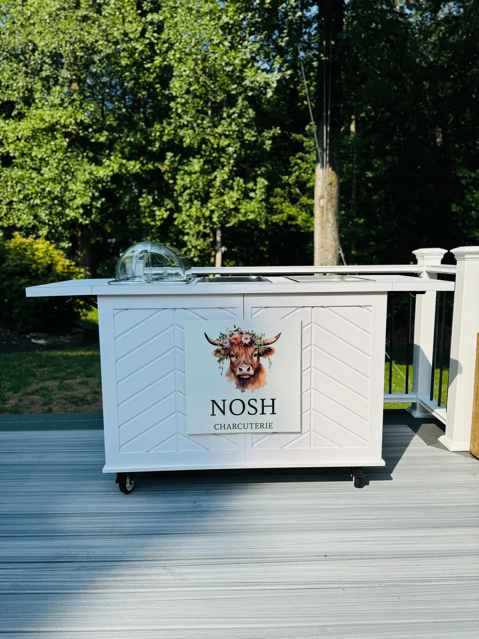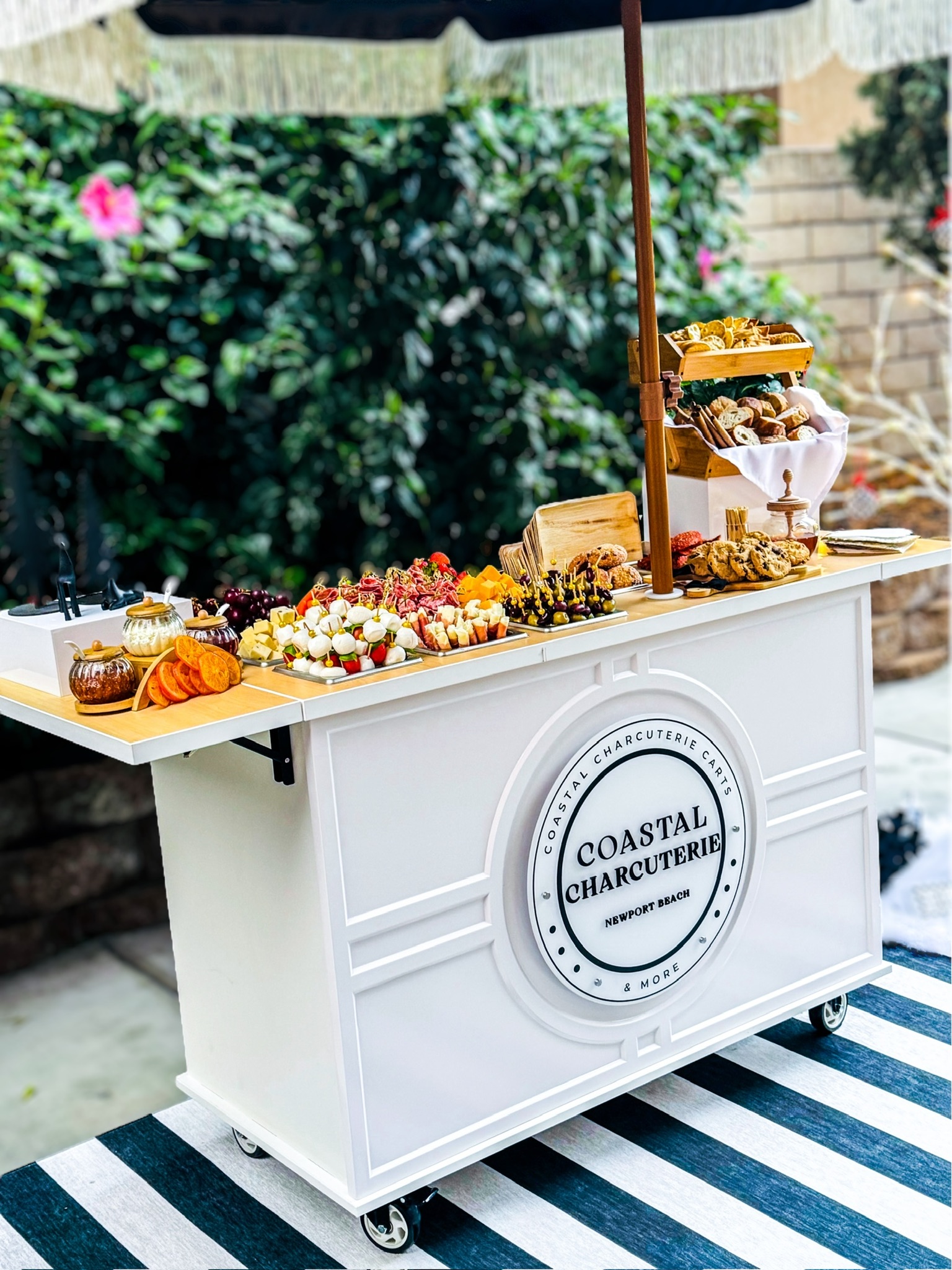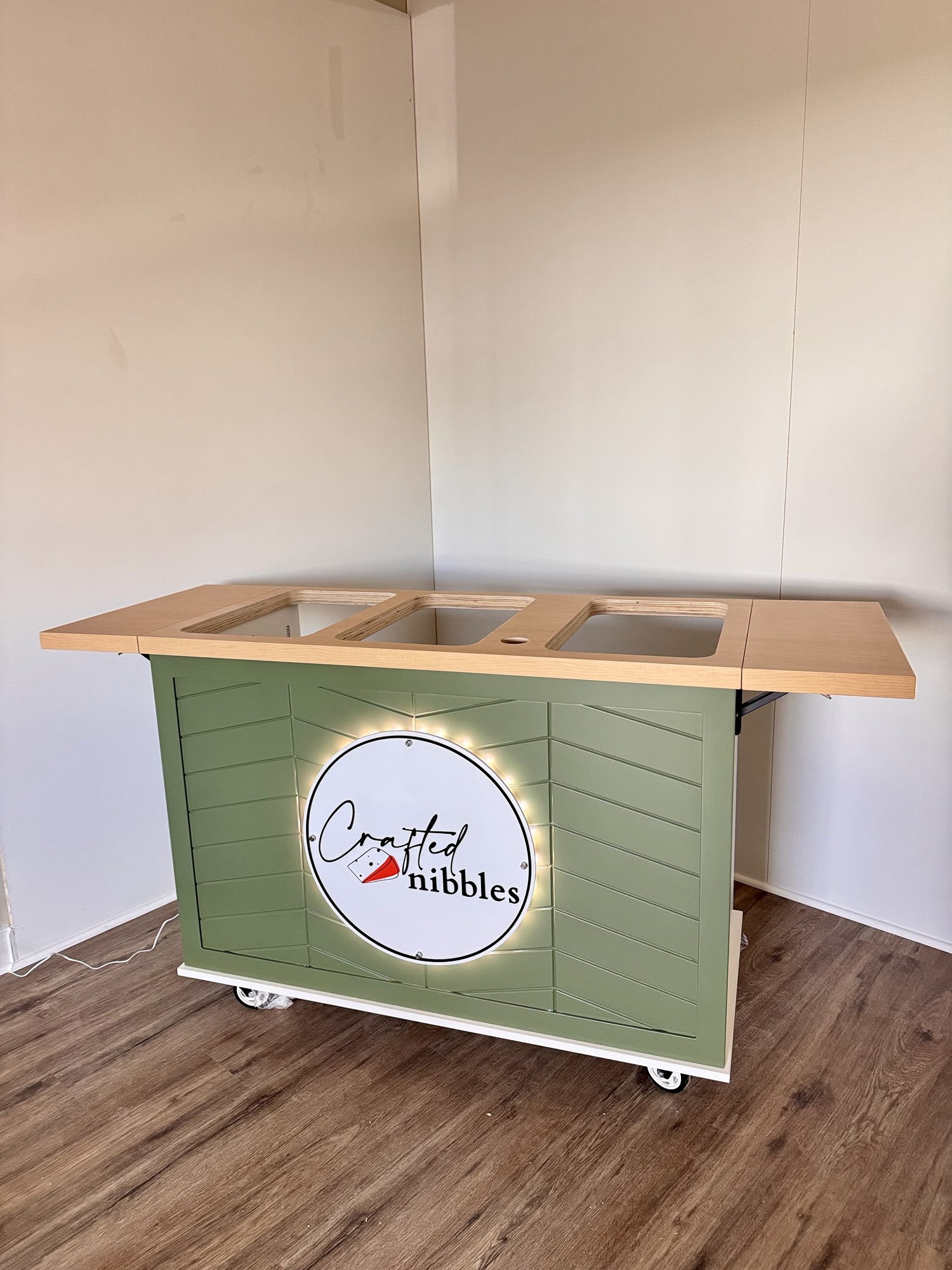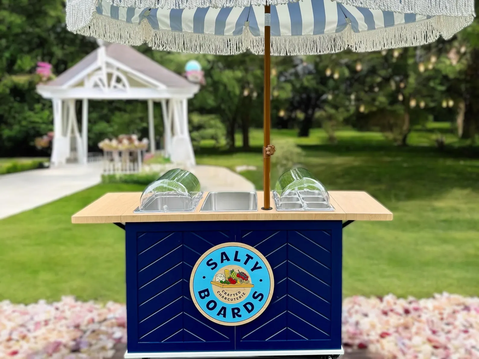 This mobile event cart is perfect for catering, parties, weddings, and vending, offering a versatile solution for serving food like charcuterie, coffee, ice cream, and snacks. The collapsible cart on wheels is ideal for use at farmers markets and other gatherings.