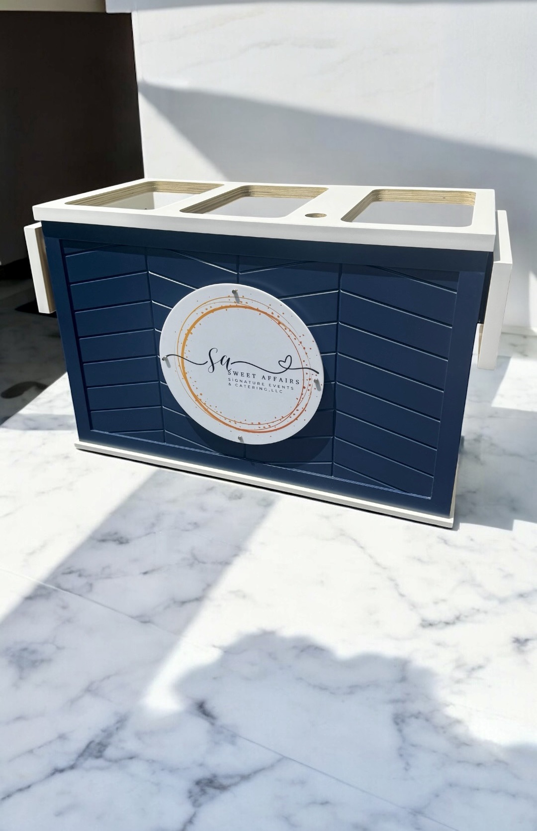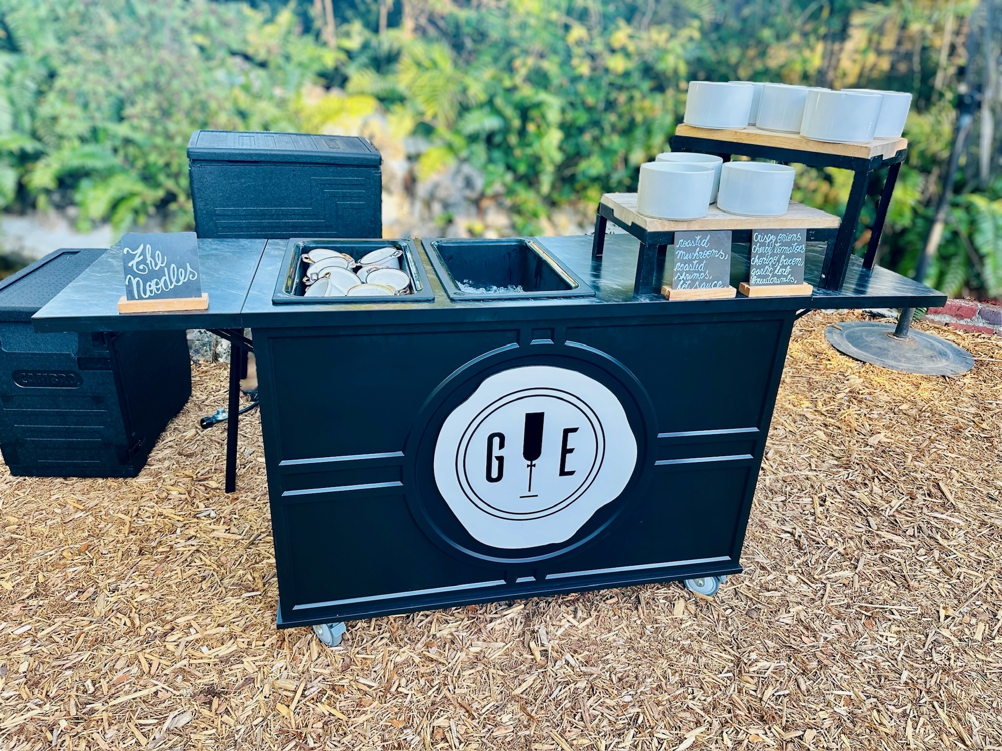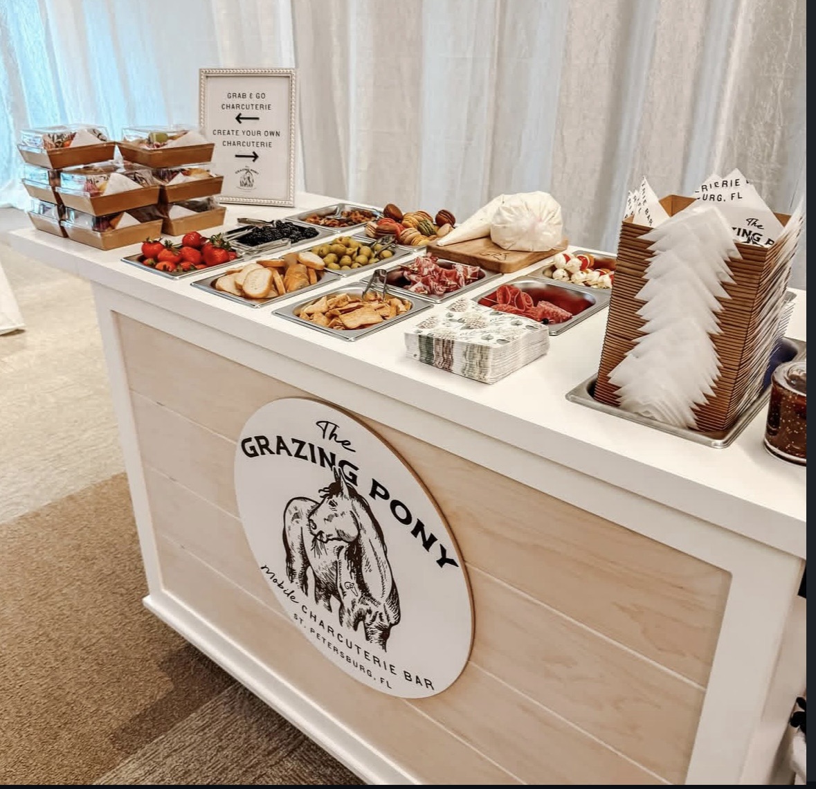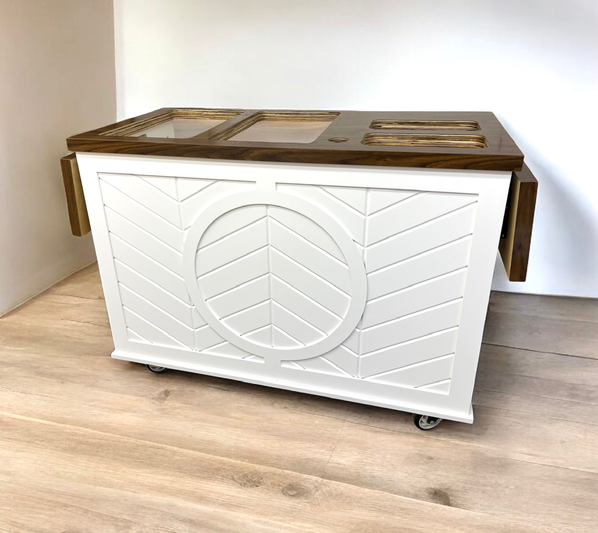 This mobile event cart is perfect for catering, parties, weddings, and vending, offering a versatile solution for serving food like charcuterie, coffee, ice cream, and snacks. The collapsible cart on wheels is ideal for use at farmers markets and other gatherings.
