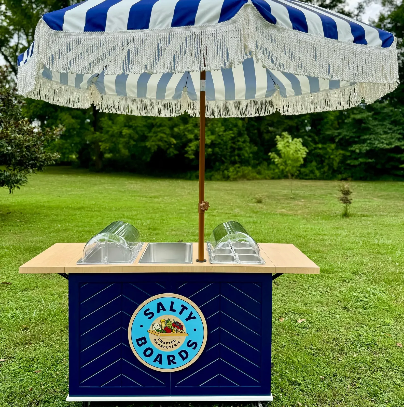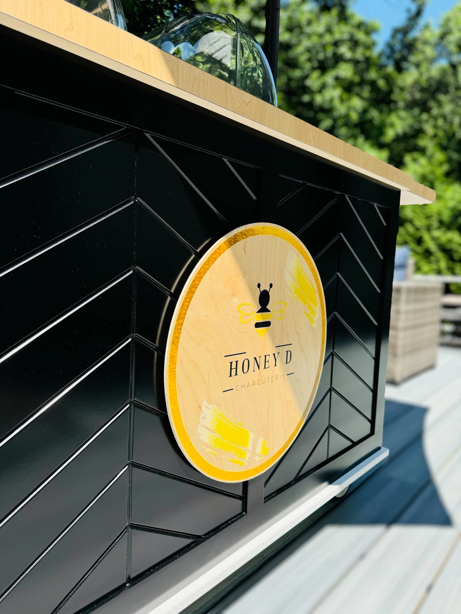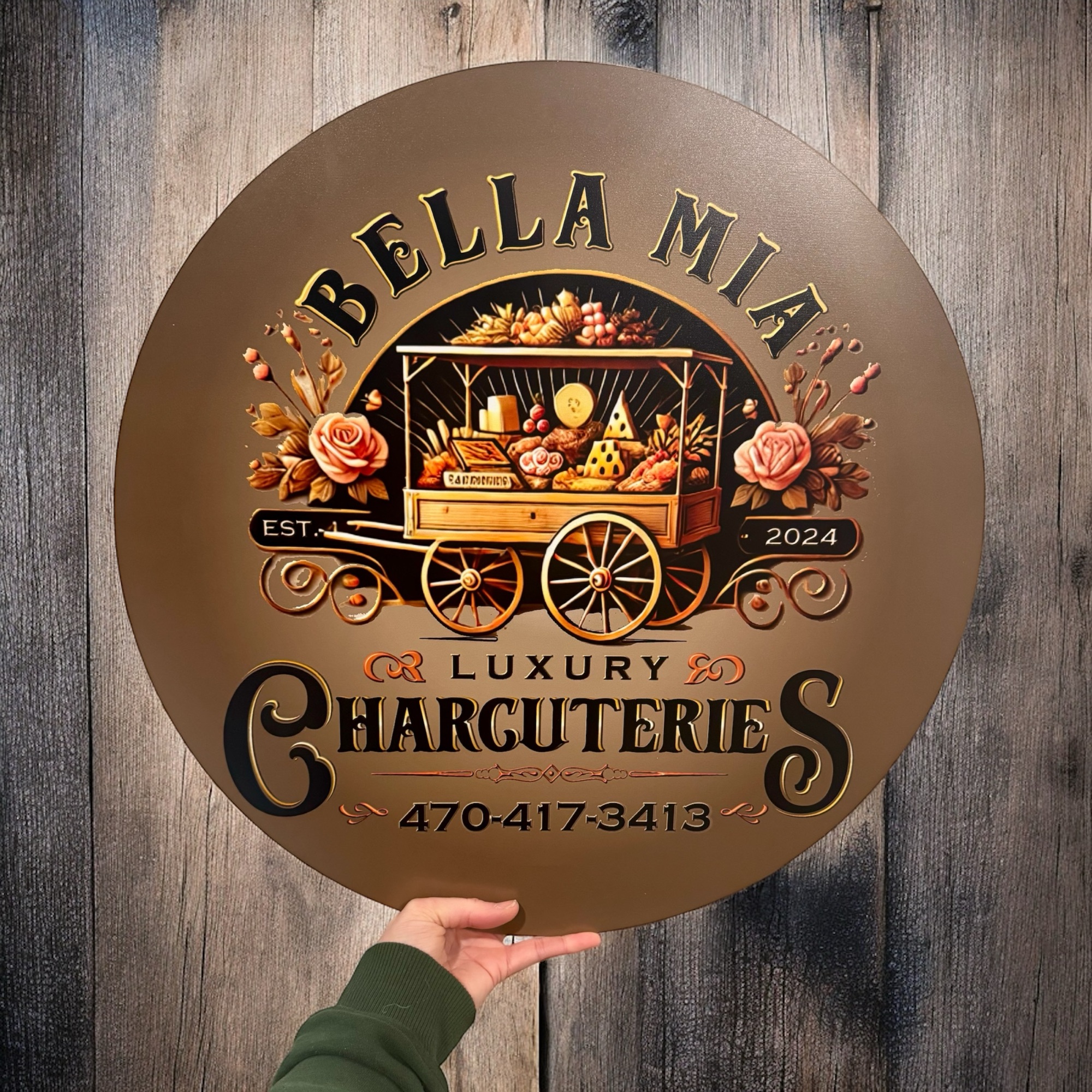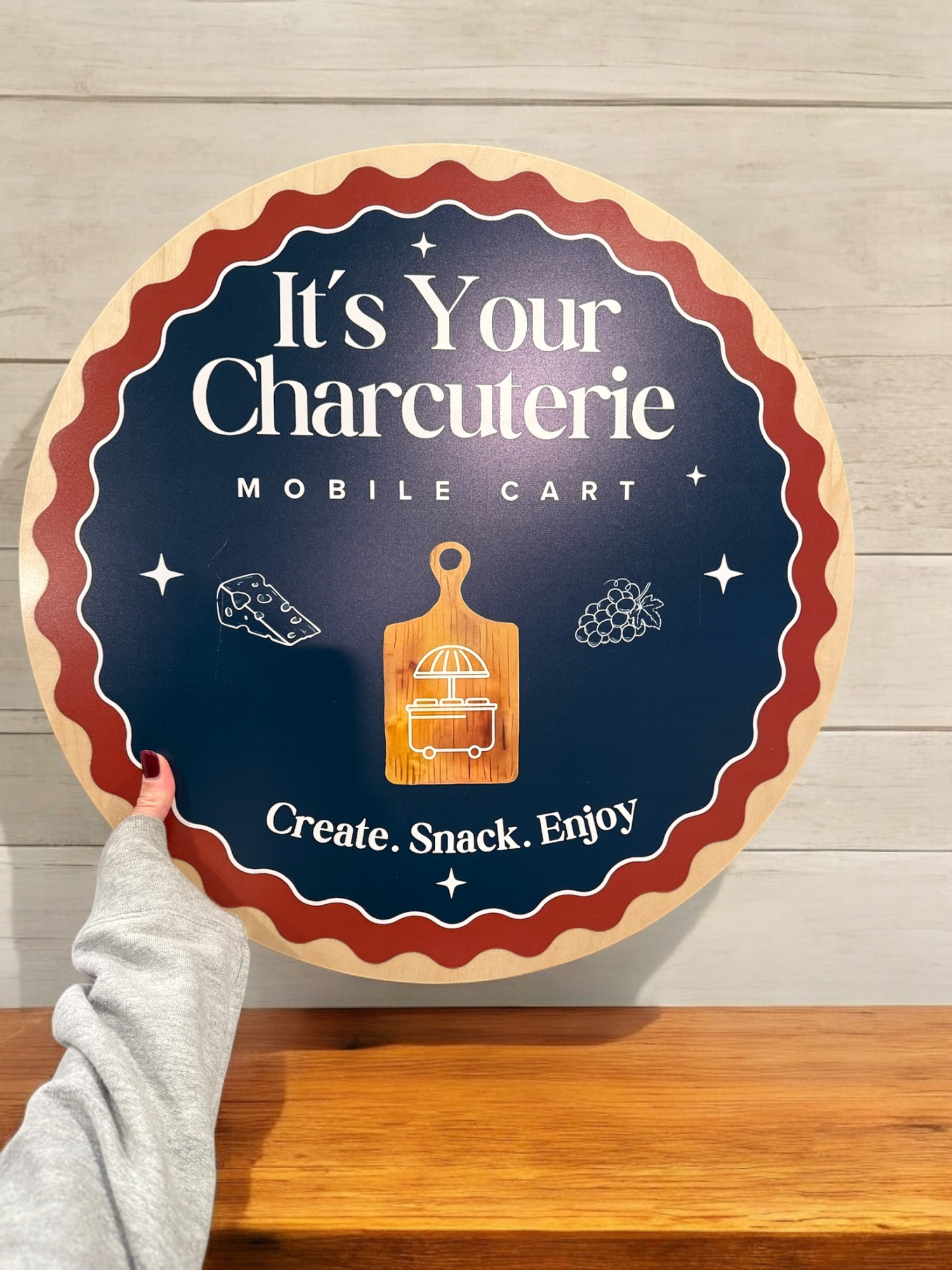 Our custom circular wooden sign is perfect for a mobile charcuterie cart, featuring a full-color logo for a snack cart. This wood sign is ideal for collapsible food and drink carts, adding a personalized and eye-catching touch to your mobile setup.