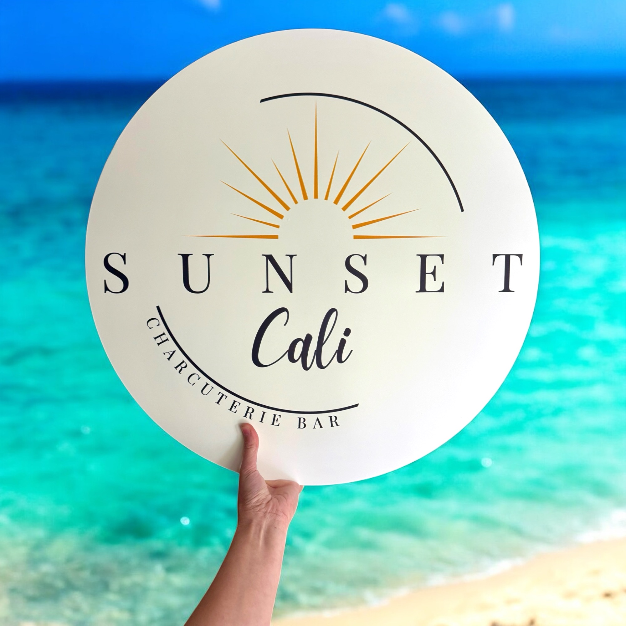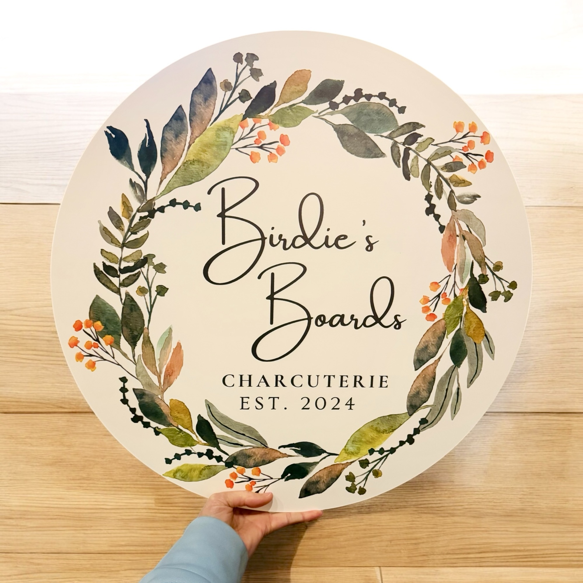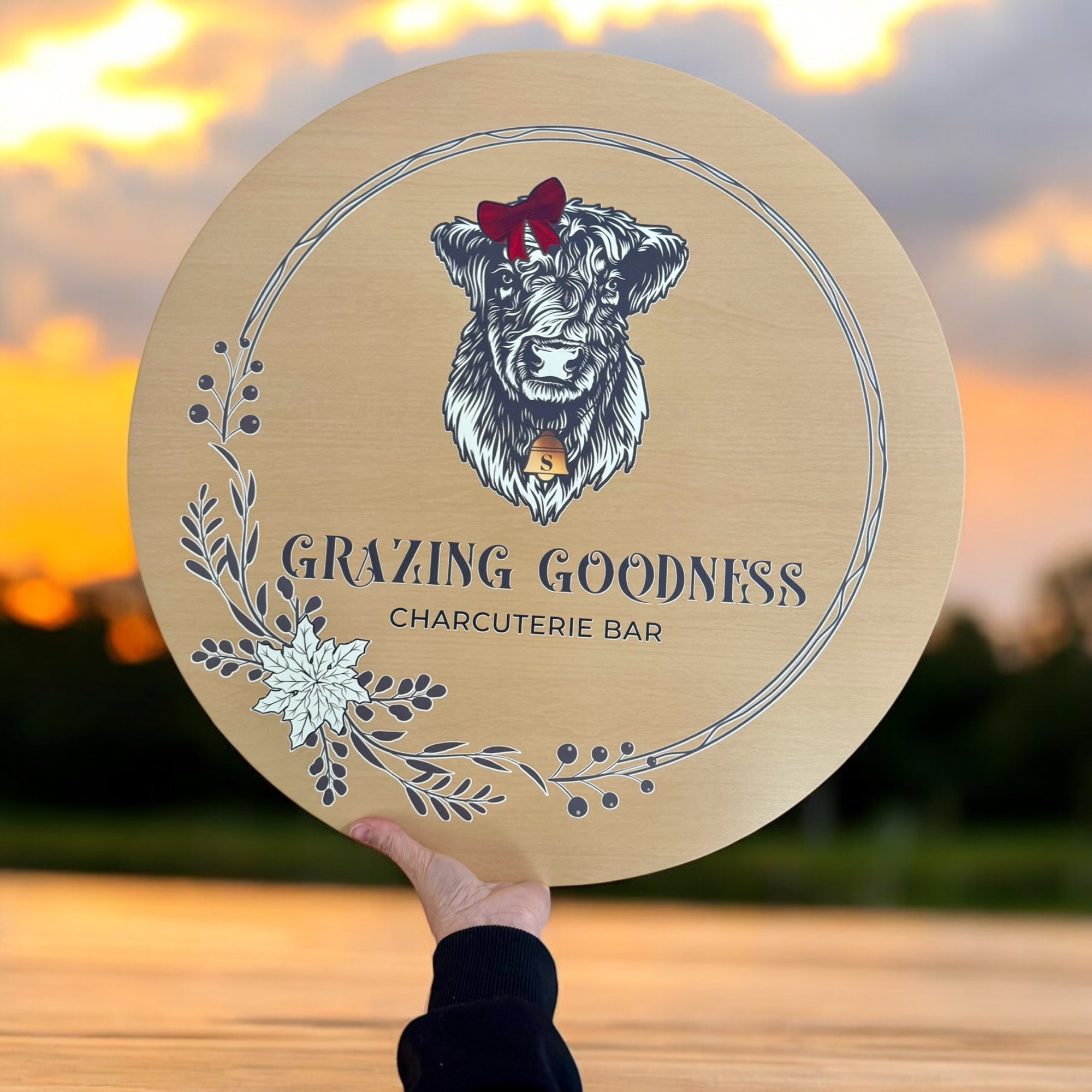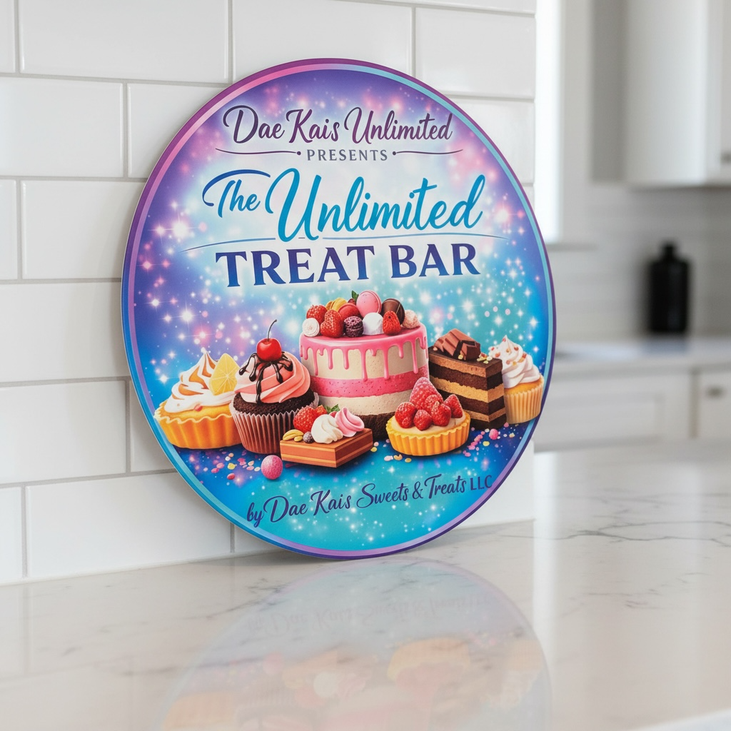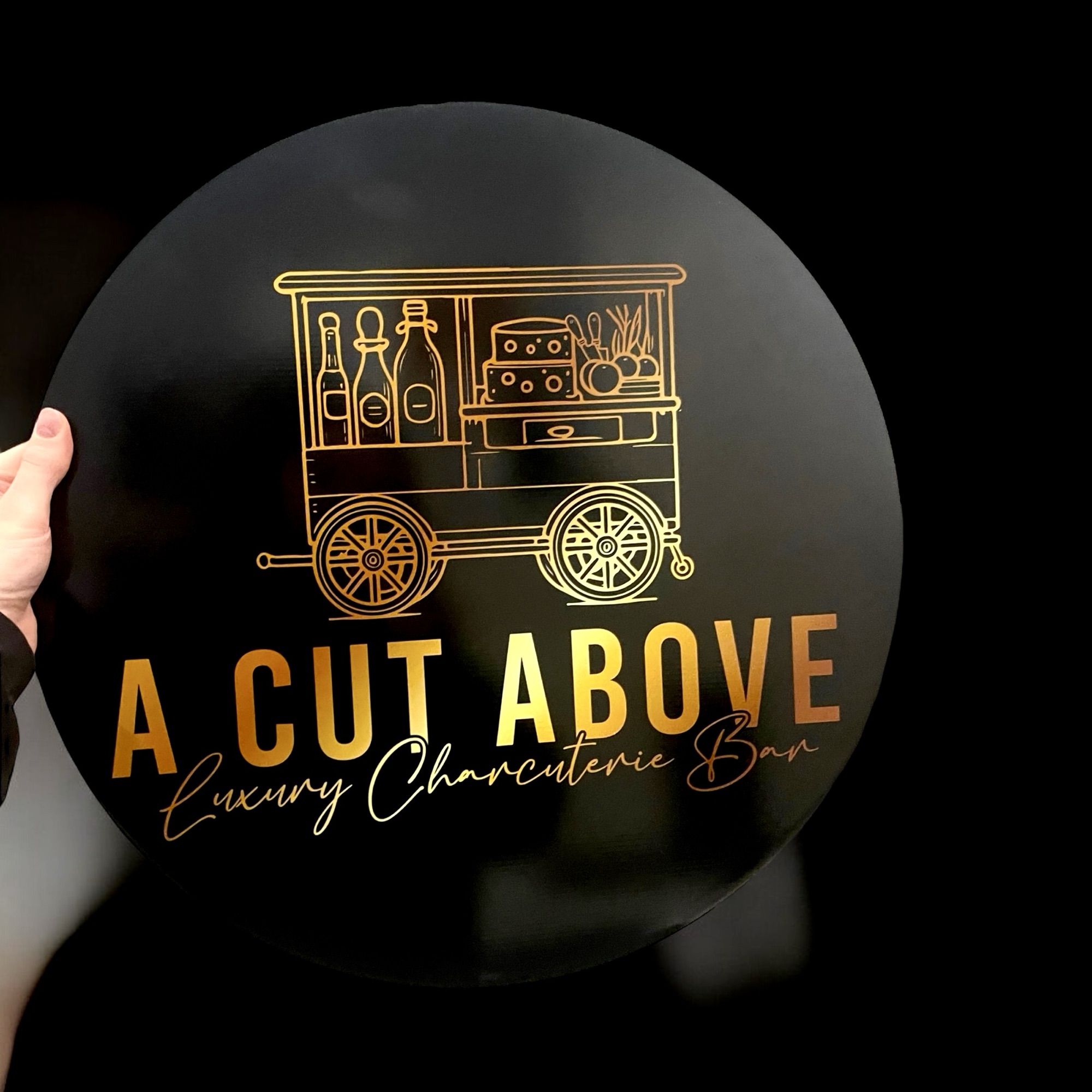 Our custom circular wooden sign is perfect for a mobile charcuterie cart, featuring a full-color logo for a snack cart. This wood sign is ideal for collapsible food and drink carts, adding a personalized and eye-catching touch to your mobile setup.