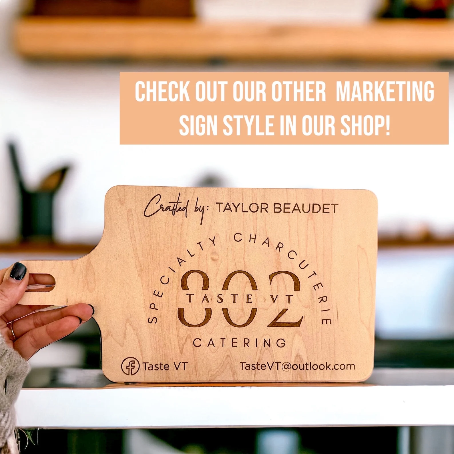 The catering company commissioned a personalized business sign, an engraved wood cutting board featuring a QR code for chef marketing and event advertisements. This unique advertisement sign effectively showcases their culinary services. Add your company’s logo, business name, phone number or any other advertising on this sign!