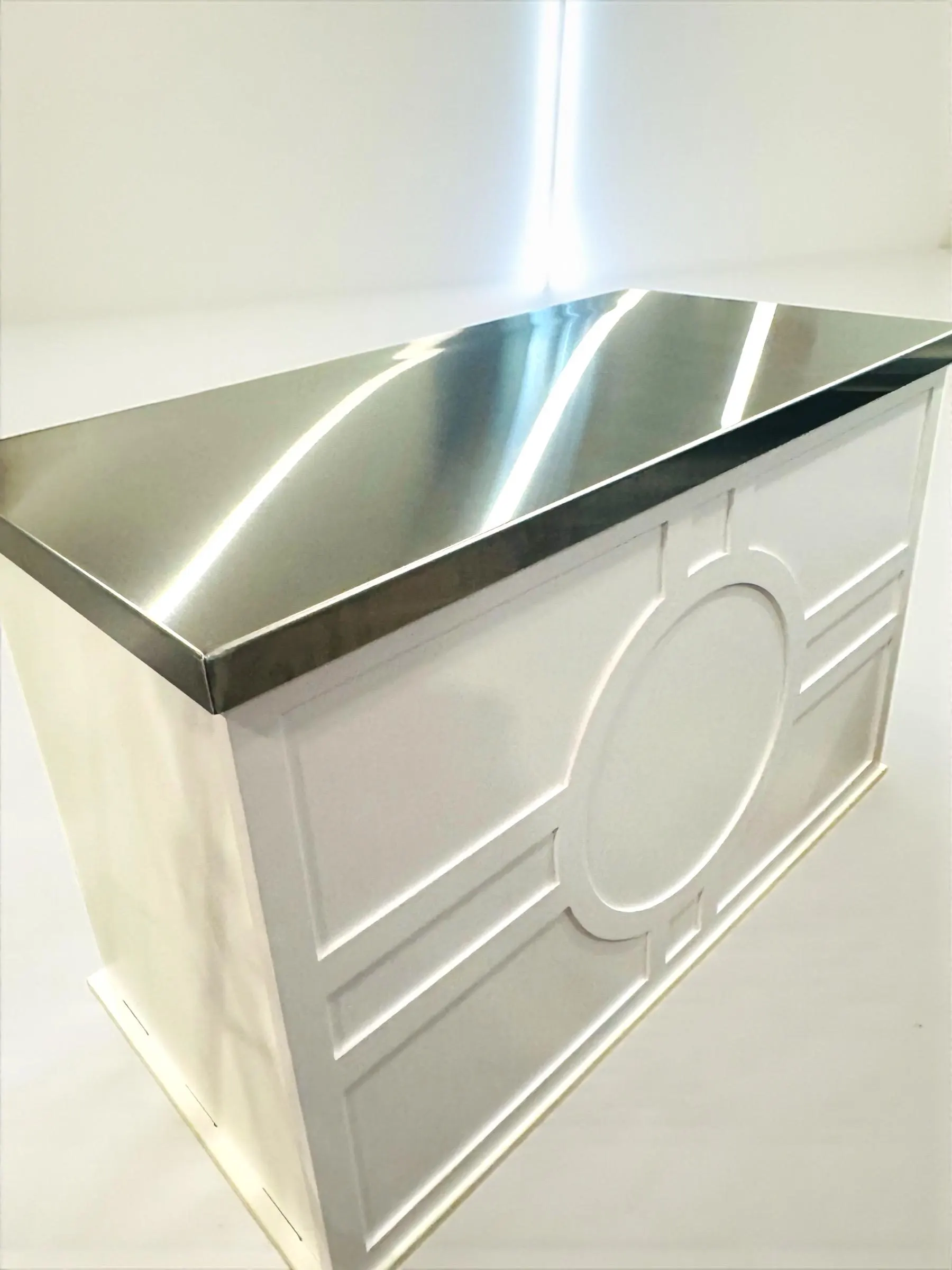 This food safe 304 Stainless Steel Fitted Topper Lid for Charcuterie Cart and Mobile Bar Cart is a durable metal cover that adds style and protection. The lightweight spillproof topper sits securely over your existing countertop, making it versatile for any event setup.